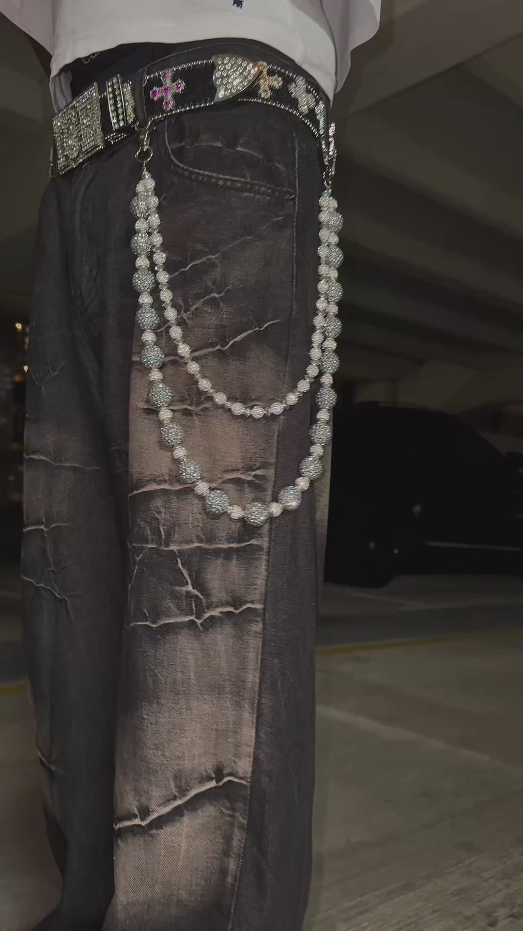 Blending flashy streetwear energy with luxury vibes, the iced-out buckle and multicolored jeweled crosses brings the perfect mix of shine and style to your fit.
